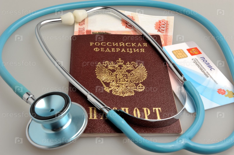 Стетоскоп, паспорт, деньги и полис медицинского страхования на сером фоне