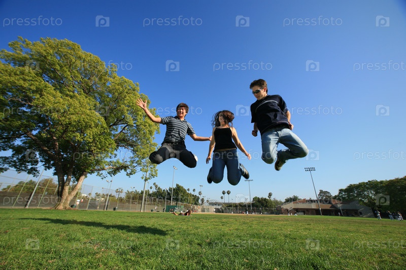 Трое счастливых друзей подпрыгивают вверх на стадионе