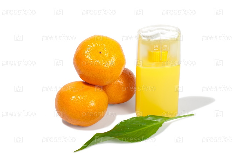 Антицеллюлитный массажный крем и три мандарина на белом фоне