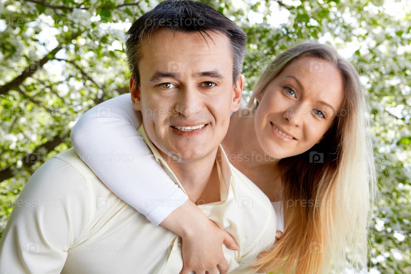 Молодая счастливая семейная пара в летнем саду