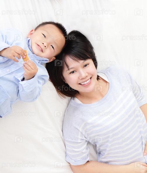 Счастливая мать с сыном на кровати
