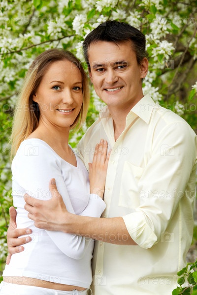 Портрет молодой счастливой семейной пары под цветущей яблоней