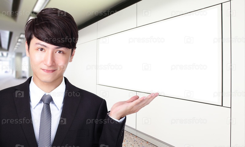 Деловой мужчина указывает на пустой рекламный щит