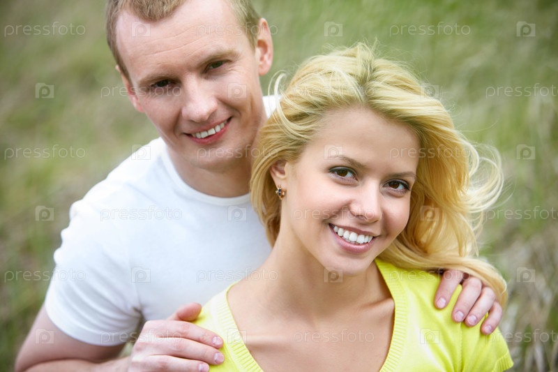 Портрет молодой счастливой семейной пары на фоне природы
