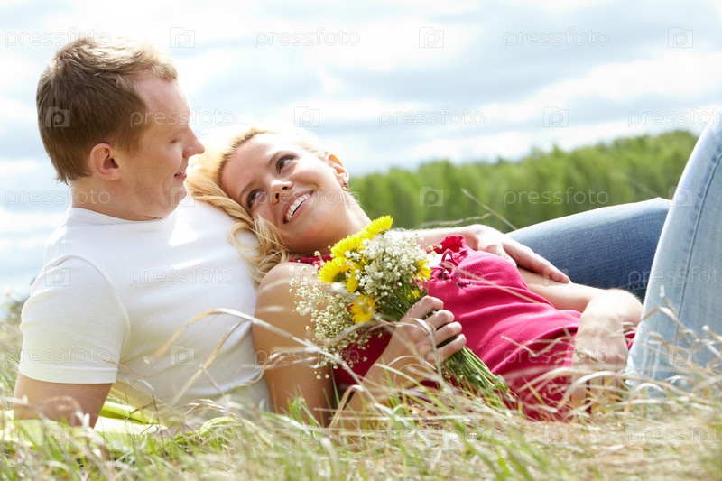 Портрет молодой счастливой семейной пары на фоне природы