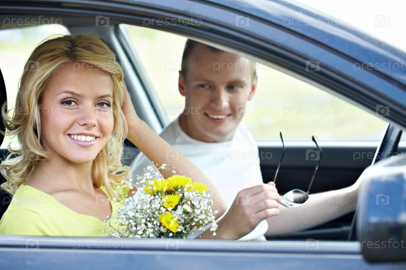 Портрет молодой счастливой семейной пары, сидящей в автомобиле