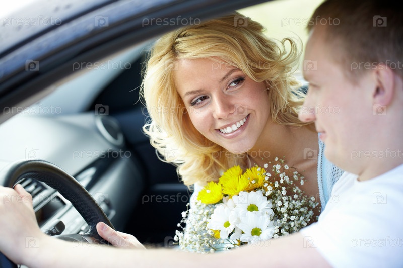 Портрет молодой счастливой семейной пары, сидящей в автомобиле