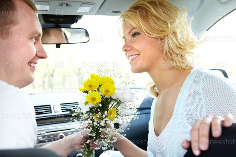 Портрет молодой счастливой семейной пары, сидящей в автомобиле