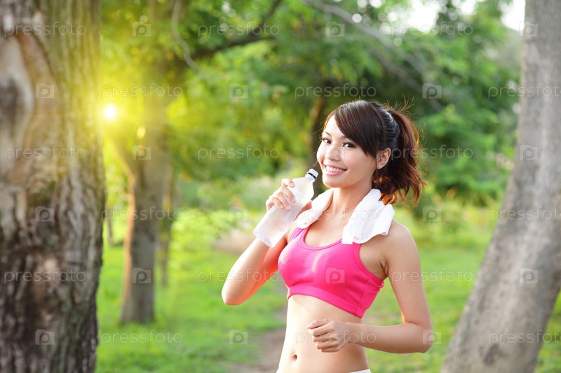 Спортивная женщина пьет воду из бутылки