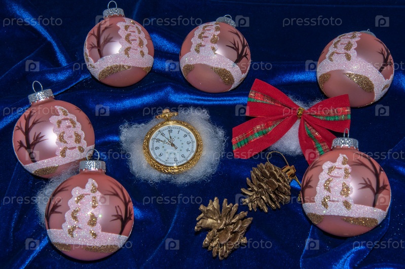 Новогодние украшения и часы на шелковом фоне
