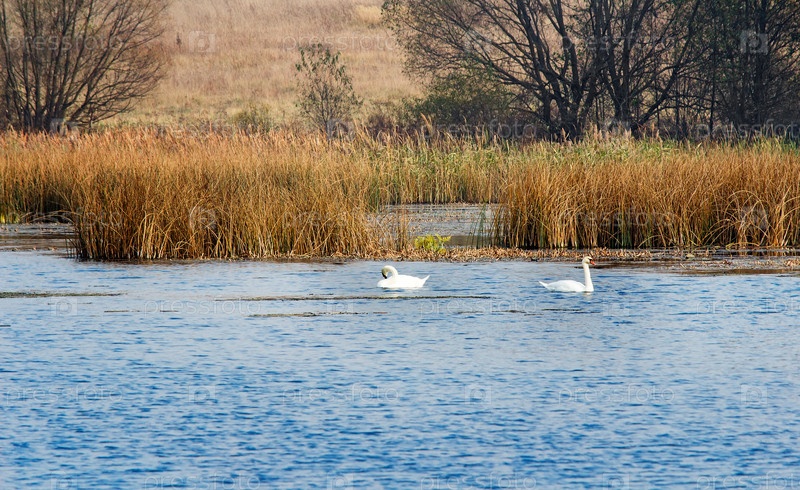 Осенний пейзаж: озеро, тростник и плавающие лебеди