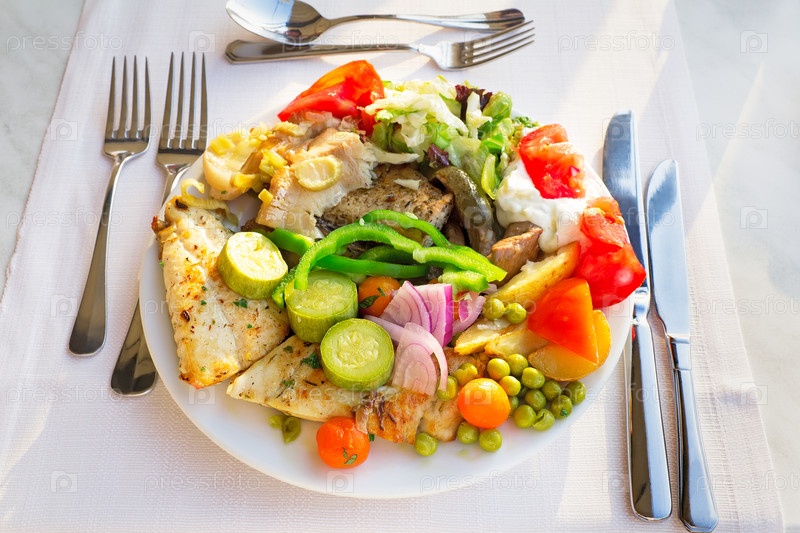 Овощной гарнир с мясом в тарелке