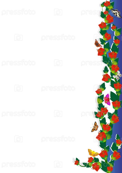Рамка с тюльпанами и бабочками, иллюстрация на белом фоне