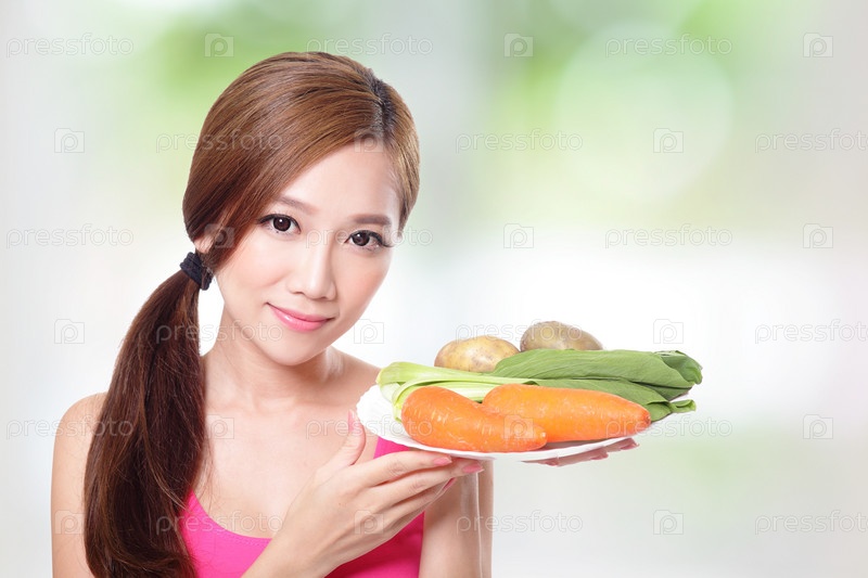 Женщина, держащая зеленые овощи и морковь