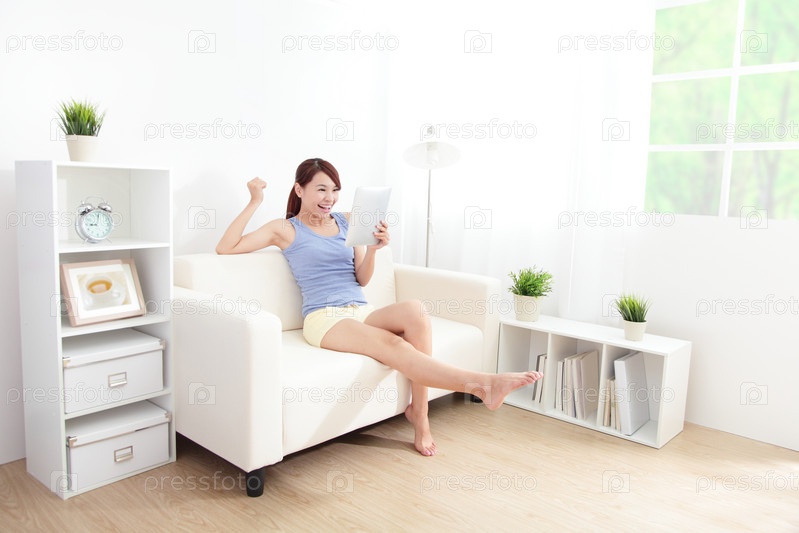 Счастливая женщина с планшетом на диване