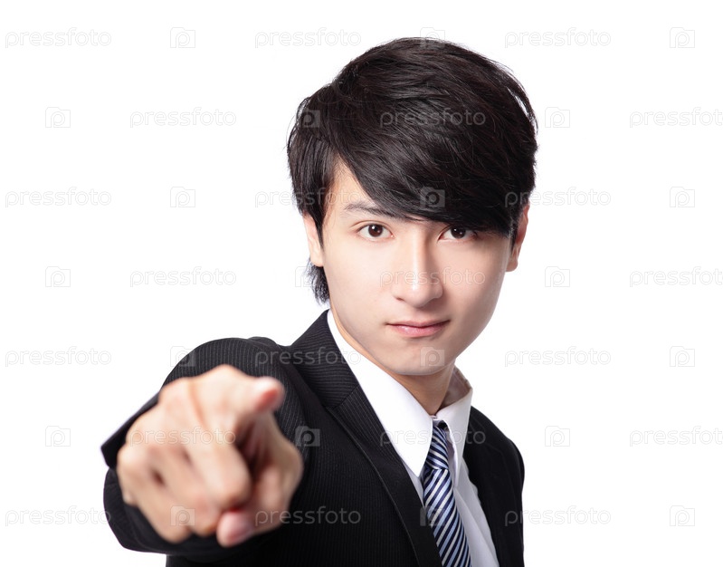 Бизнесмен указывает пальцем в камеру
