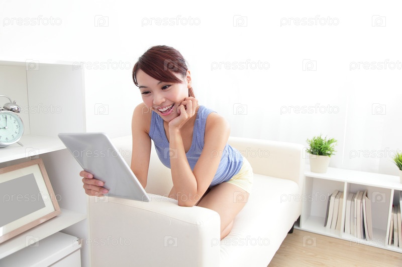 Счастливая женщина с планшетом на диване