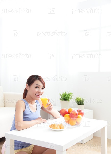 Жизнерадостная женщина пьет апельсиновый сок