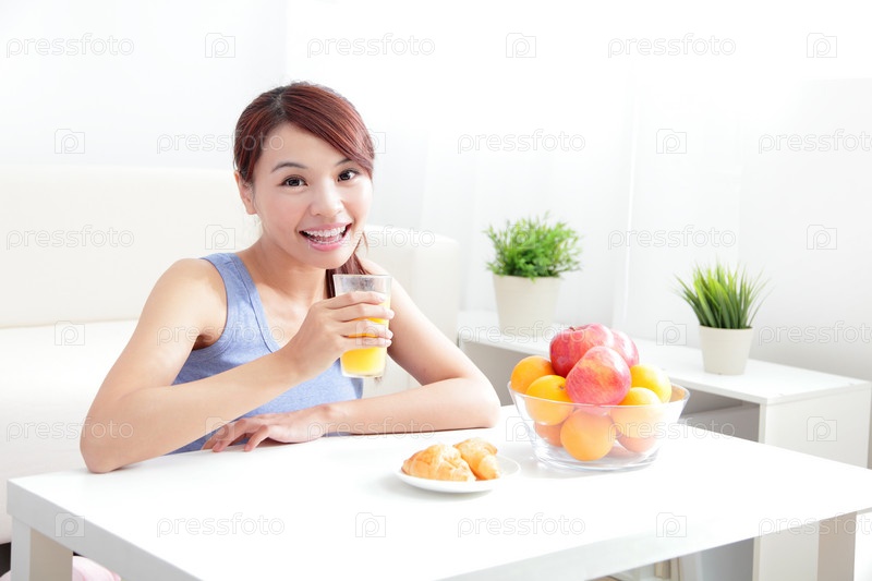 Жизнерадостная женщина пьет апельсиновый сок