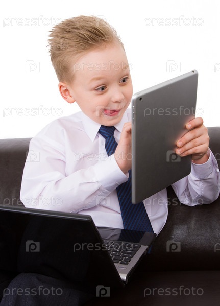 Школьник с ноутбуком и планшетом