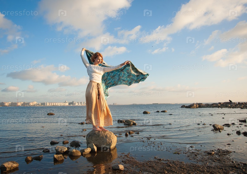 Девушка позирует на берегу озера