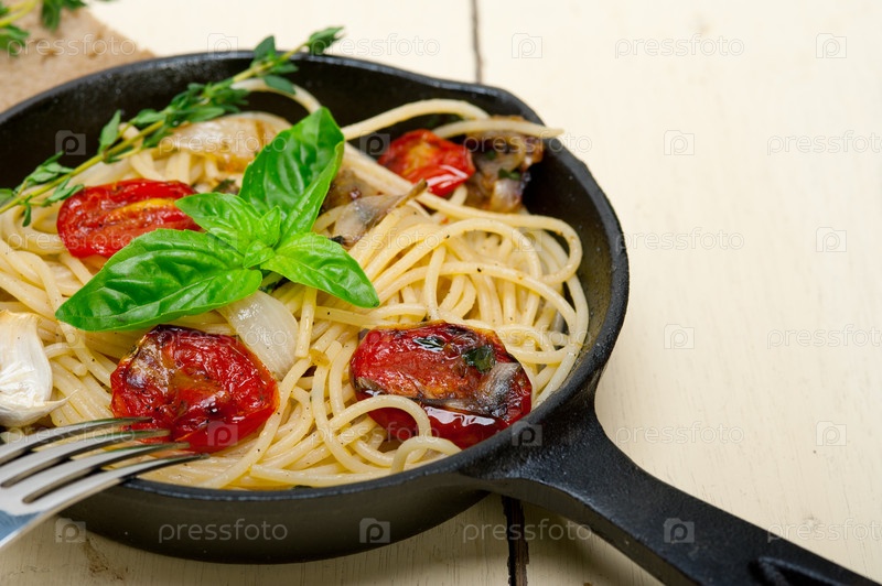 Спагетти с помидорами черри и базиликом