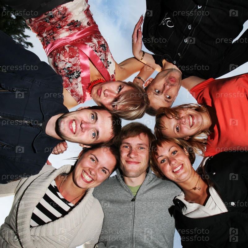 Группа счастливых молодых людей в круге на открытом воздухе