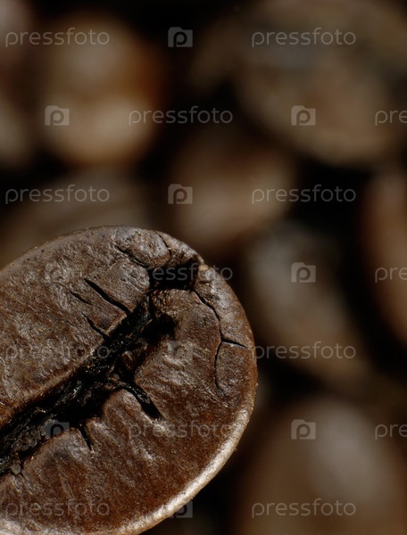 Кофейные бобы в глубоких тени на фоне нефокусированных зерен