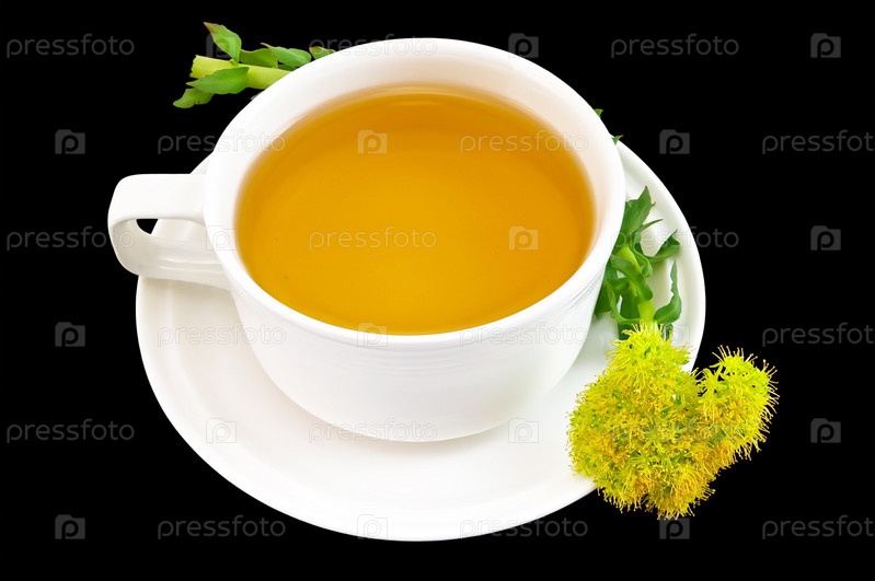 Целебный травяной чай в белой фарфоровой чашке с цветком золотого корня на черном фоне
