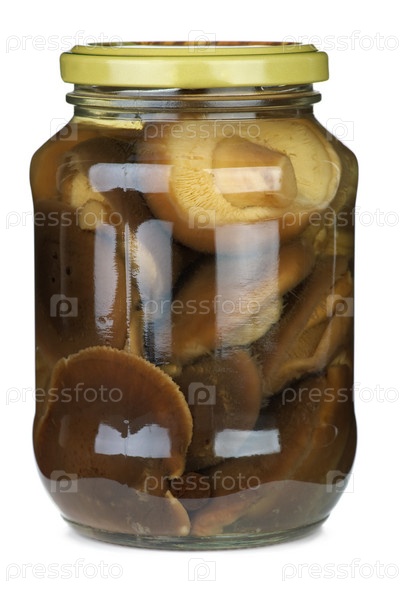 Маринованные грибы в стеклянной банке на белом фоне
