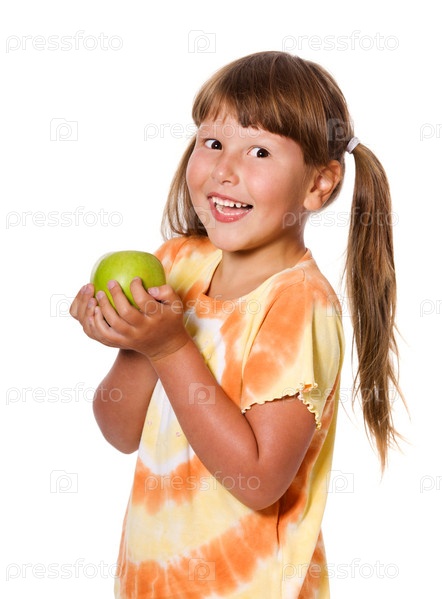Шестилетняя девочка держит яблоко, изолирована на белом