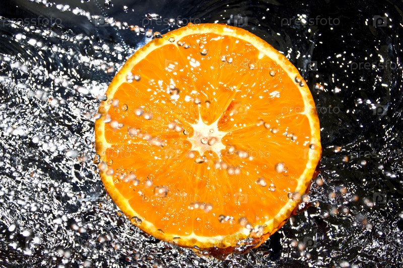 Апельсин в каплях воды на черном фоне