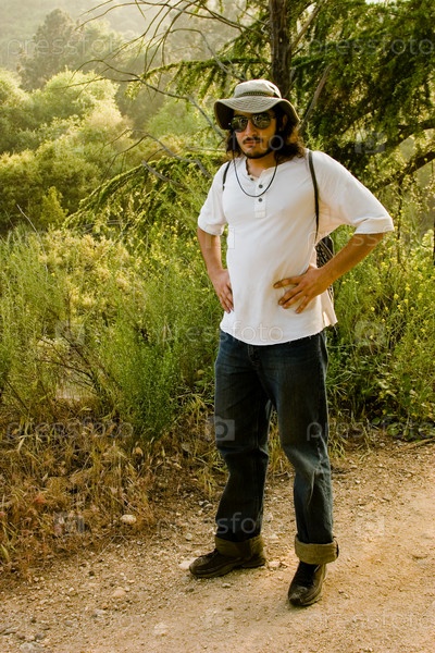 Молодой человек стоит на лесной дороге