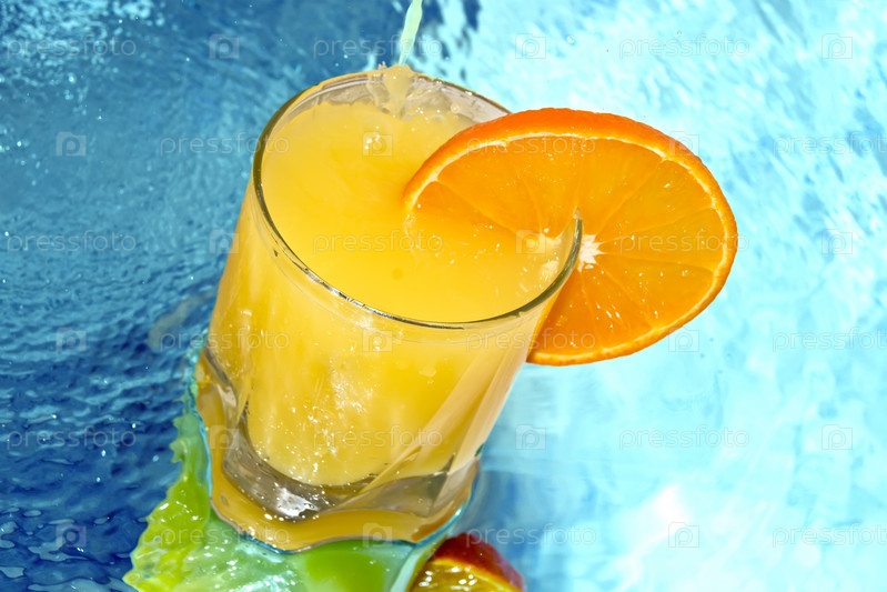 Апельсиновый сок и кружок апельсина на фоне воды