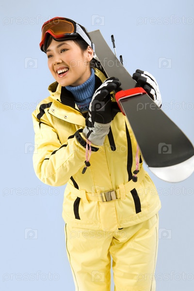 Портрет красивой женщины в спортивной одежде, несущей лыжи