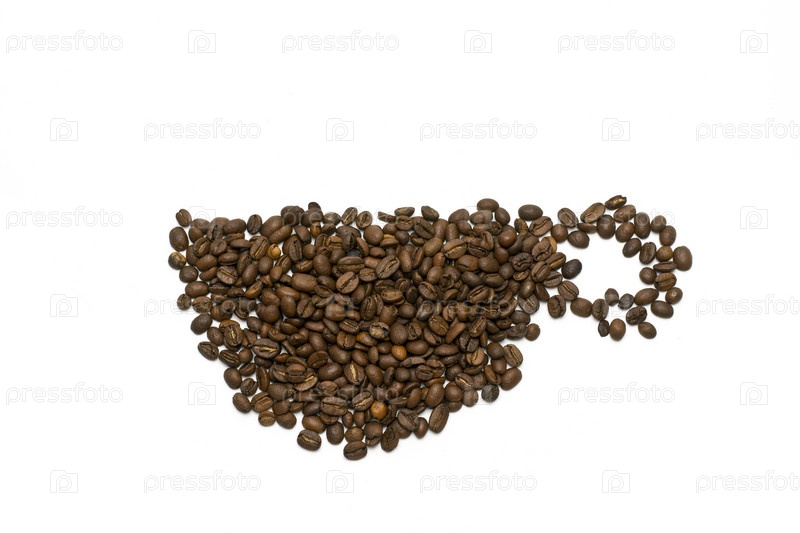 Чайная чашка, выложенная из зерен кофе, на белом фоне