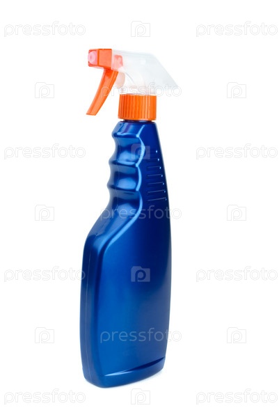 Синяя пластиковая бутылка с распылителем на белом фоне