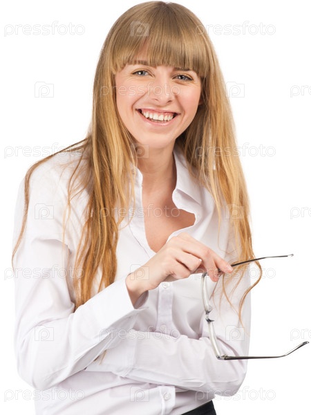 Портрет улыбающейся деловой женщины с длинными светлыми волосами и очками в руке