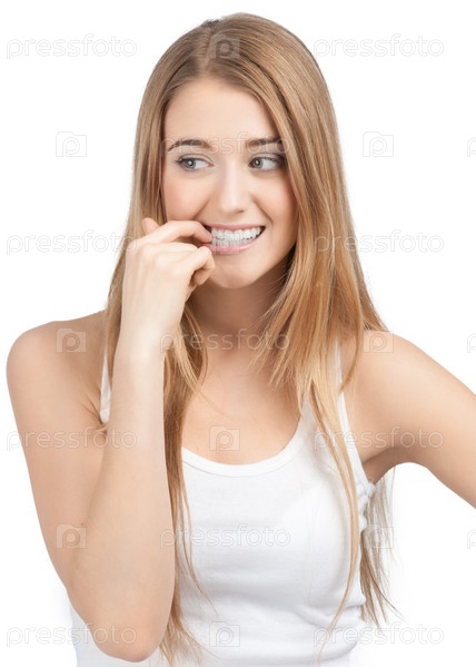 Портрет задумчивой молодой женщины, кусающей ногти. На белом фоне