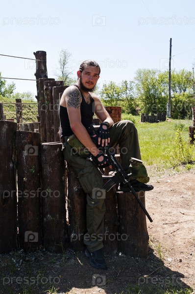 Бородатый мужчина с пейнтбольным ружьем
