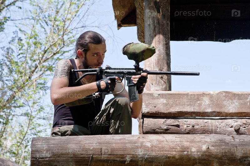Мужчина с пейнтбольным ружьем