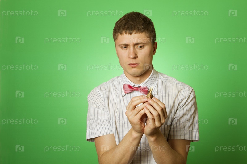 Молодой человек с луковицей тюльпана на зеленом фоне