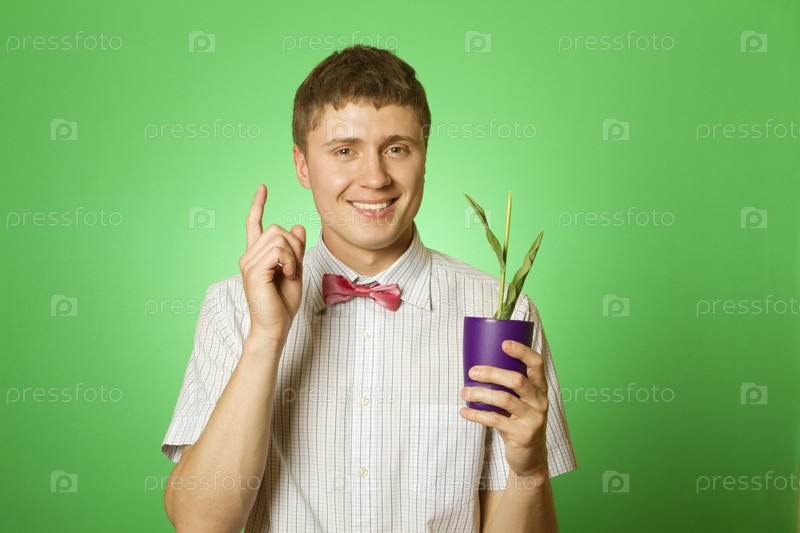 Молодой человек с ростком тюльпана на зеленом фоне