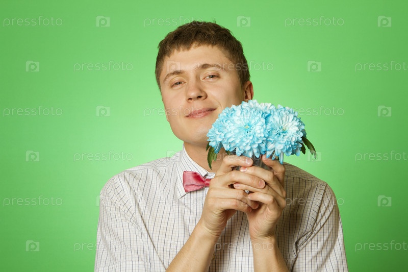 Молодой человек с букетом хризантем на зеленом фоне