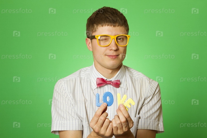 Молодой человек на зеленом фоне держит буквы LOVE в руках