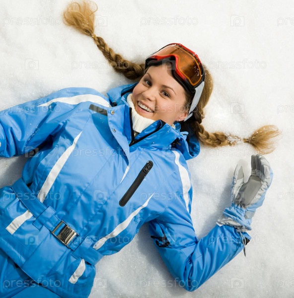 Портрет женщины со лыжами, отдыхающей на снегу