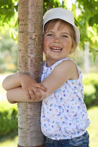 Маленькая очаровательная девочка позирует возле дерева в парке