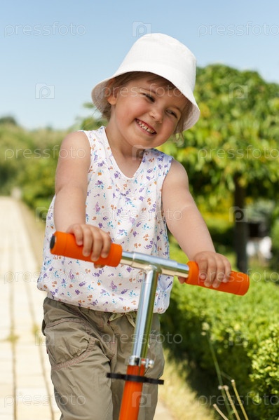 Маленькая очаровательная девочка позирует на самокате в парке