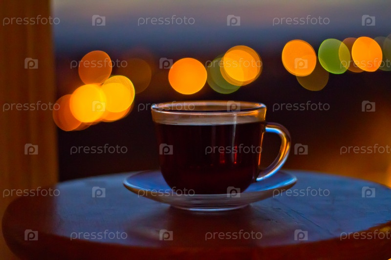 Чашка чая на столике на фоне ночных городских огней