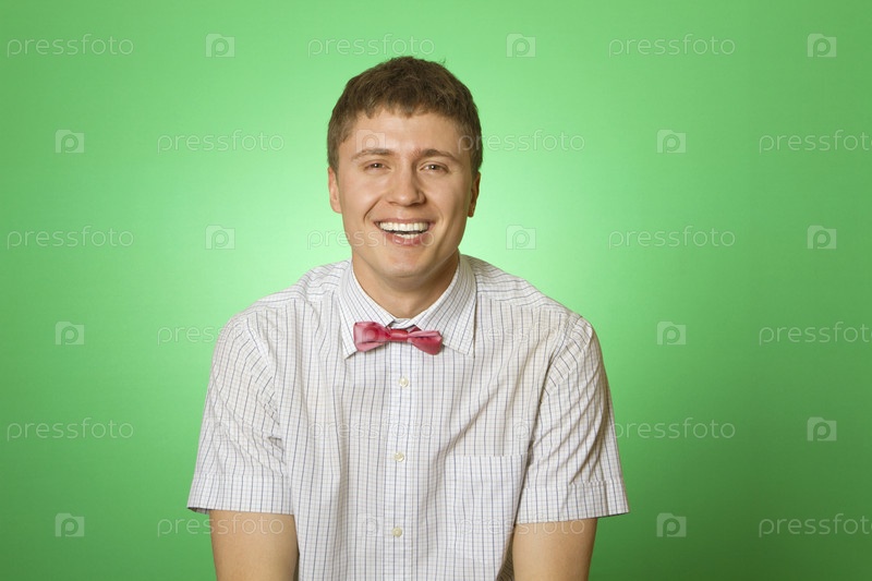 Красивый молодой человек на зеленом фоне улыбается в камеру